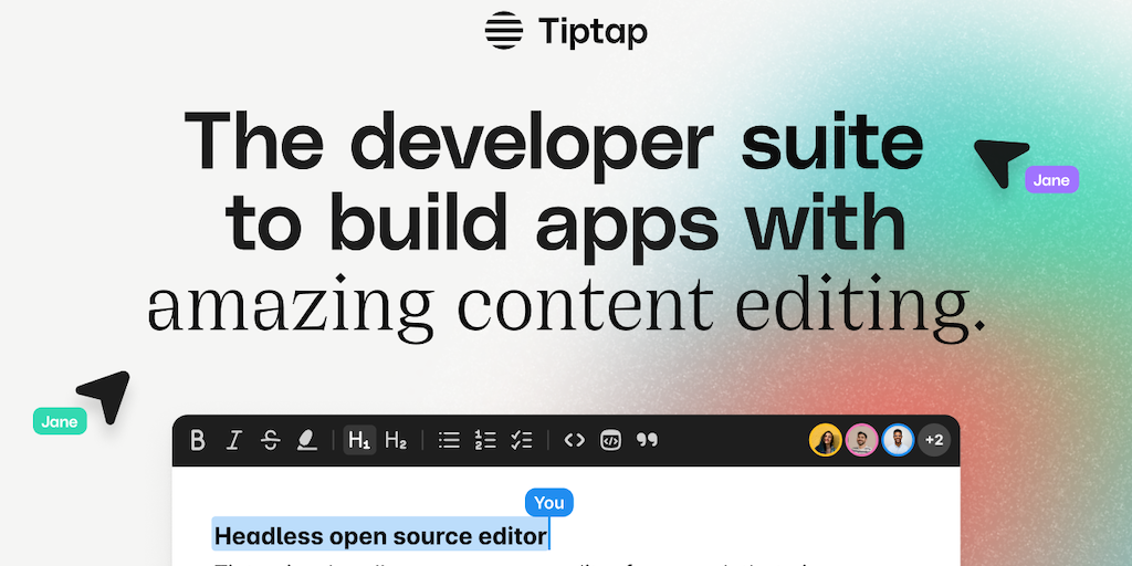 Tiptap is a suite of open source content editing and real-time collaboration tools for developers building apps like Notion or Google Docs. It’s used by thousands of businesses worldwide, including Gi