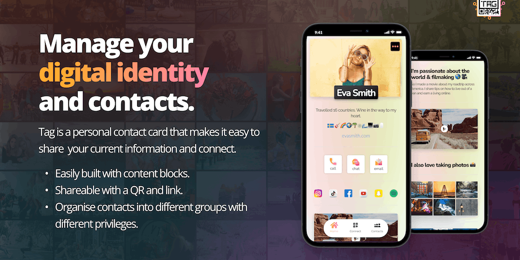 Tired of having your information and contacts scattered across the internet? With Tag, you can bring it all into one place and easily share it with a QR or link. Keep contacts organised with groups an