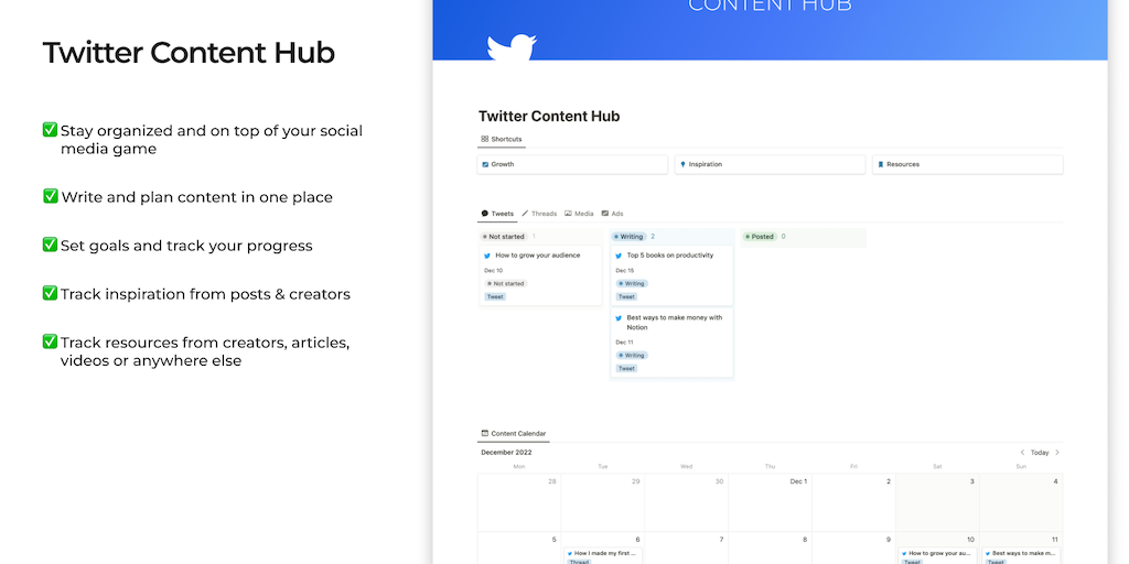 Twitter Content Hub Notion Dashboard - Write, plan and organize your Twitter content with ease | Product Hunt