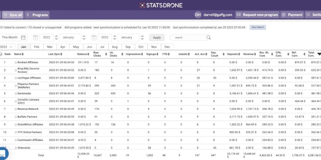 StatsDrone is a cloud based app that helps you pull and store your clicks, sales, signups, revenue and commissions earned from gambling affiliate programs. The app is cloud based and you can schedule