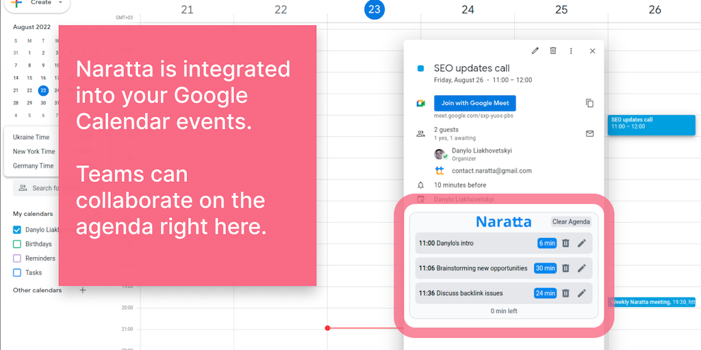 Collaborate on your agendas. Stay on track and make the most out of your time. Naratta helps the meeting participants: -Collaborate on the agenda -See the agenda in the meeting -Stay on track with all