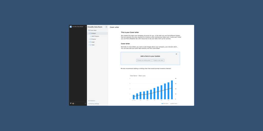 Data rooms are the culmination of a fundraise, diligence or an M&A event. With Visible Data Rooms, you’ll be able to manage every aspect of your Fundraising Funnel directly in Visible.