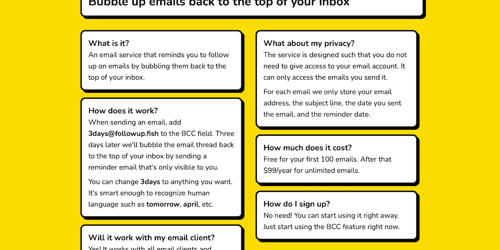 Followup Fish is an email service that reminds you to follow up on emails by bubbling them back to the top of your inbox. It works anywhere and requires no privacy-invasive browser extension or full a
