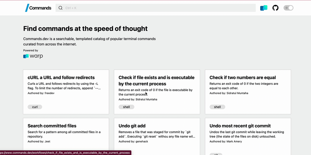 Commands.dev is a curated collection of popular terminal commands. -Search for hard to remember terminal commands by tag, description, and title -Share commands with teammates and friends -Contribute
