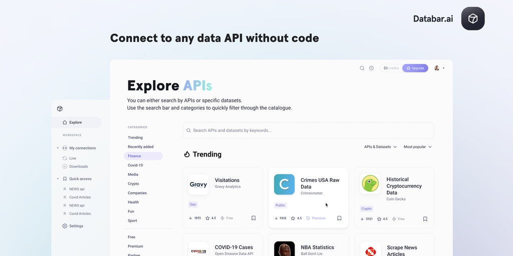 Databar.ai is a no-code API marketplace. Connect to any data API in under 3 clicks! 🚀 No technical expertise required 🏁 Fast and easy: from landing to dataset in under 30 seconds ✅ Automated authoriza