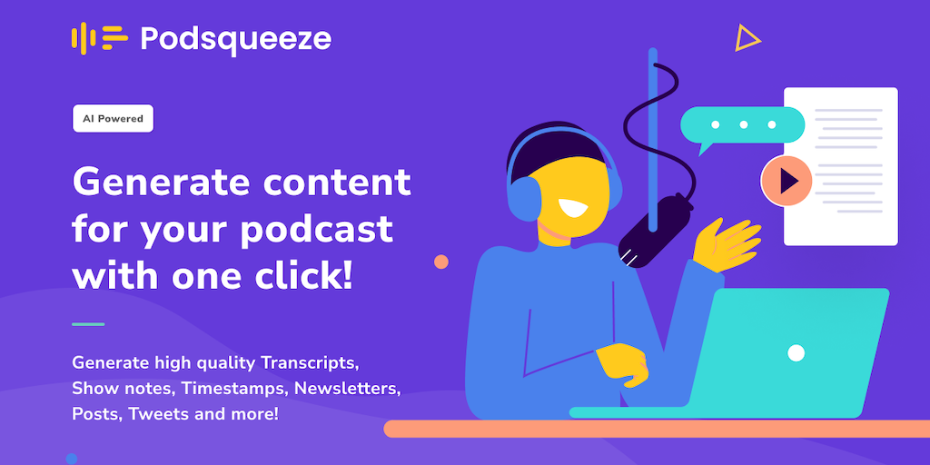 Podsqueeze is a user-friendly AI-powered tool that allows podcasters to generate and customize quality Transcripts, Show Notes, Timestamps, Newsletters, Social Posts, Tweets, and other types of conten