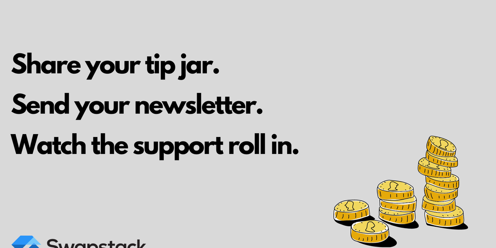 The Tip Jar by Swapstack enables newsletter writers to collect tips from their readers, for free. Connect with your readers in a new way & diversify your income! 🛠 A shareable Tip Jar page. 💰 Accept d