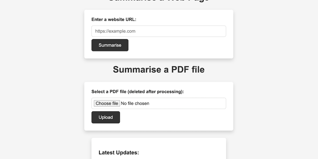 Paste in a web URL, or upload a PDF.... With the help of gpt-3.5-turbo, you'll get back a summary including a title, three bullet points and a 100 word summary. Handy for quickly getting the grasp of