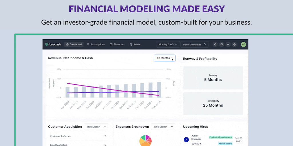 Forecastr helps founders build great financial models online. Our analysts work with you to build a model that’s tailored to your unique needs. Forecastr makes it easy to track & share key metrics so