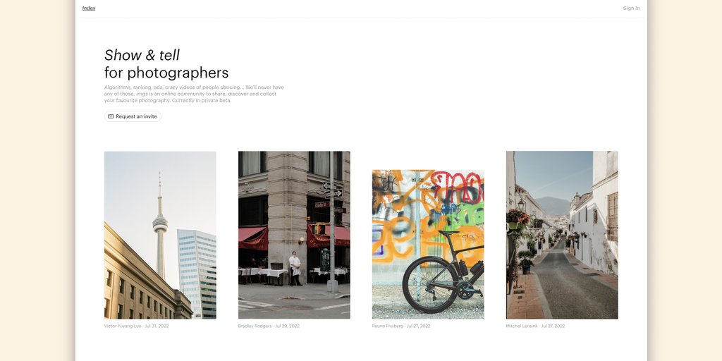 Algorithms, ranking, ads, crazy videos of people dancing... We'll never have any of those. imgs is an online platform to share, discover and collect your favourite photography.