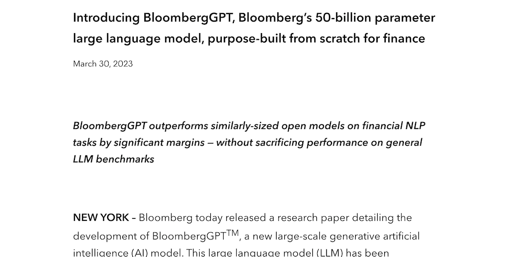 BloombergGPT - Bloomberg’s 50B parameter LLM, built for finance tasks | Product Hunt