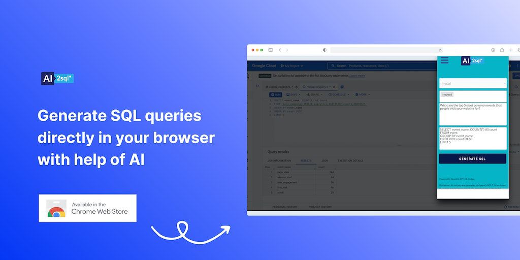 Generate a SQL query using the AI2sql Chrome extension. It generates an SQL query based on your input. With this simple and useful tool, you'll be able to generate the query quickly from your web brow