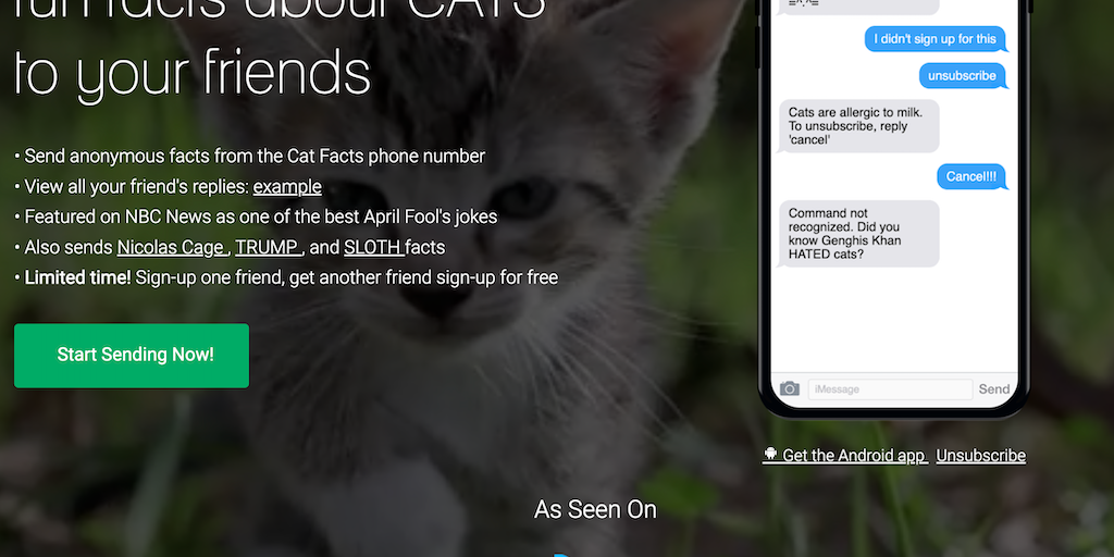 Based on one of the most highly upvoted Reddit posts of all time, I created an app that lets you automatically and anonymously send Cat Facts to your friends. A harmless jape that lets you see your fr