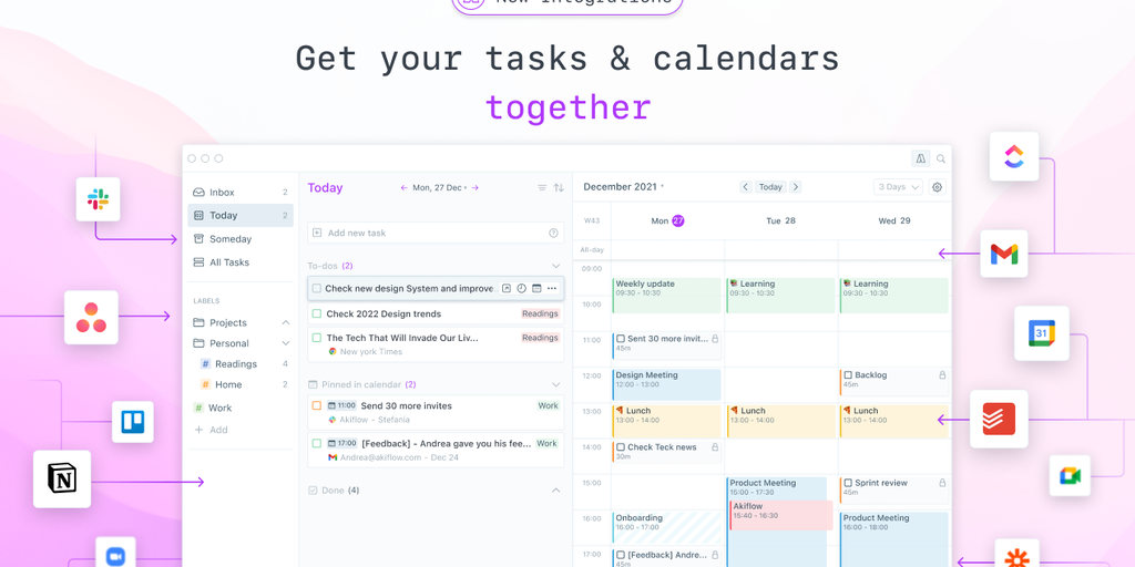 With Akiflow you can: ✔️ Import your tasks from your tools in a single inbox 📅 Block time for your tasks in the calendar ⚡ Use Shortcuts and the Command Bar to create tasks/events 🔔 Get alerts before