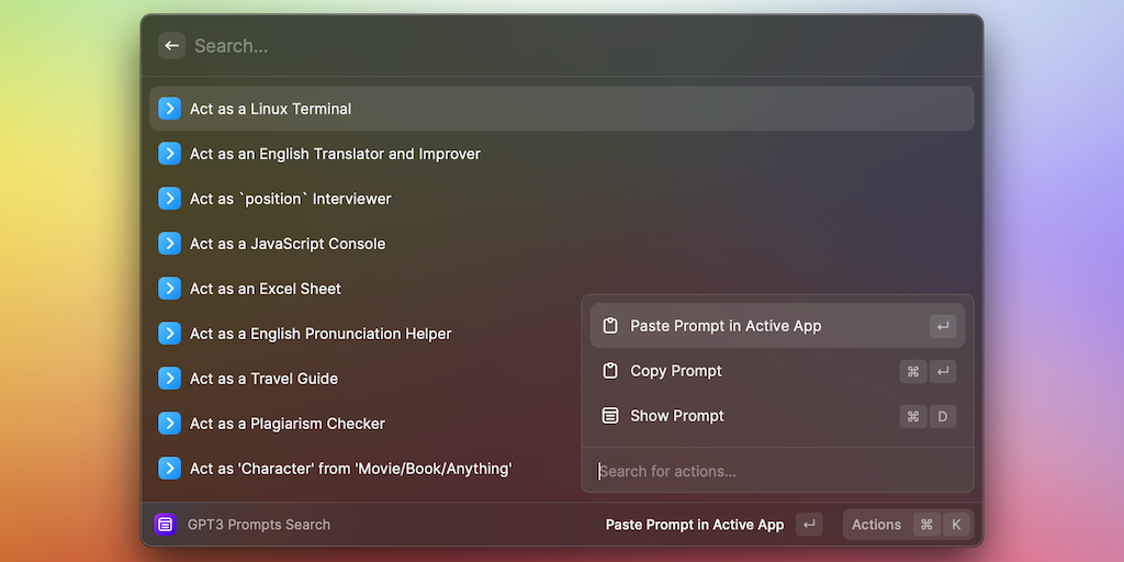 Quickly access popular ChatGPT prompts in Raycast and copy them for quick pasting!
