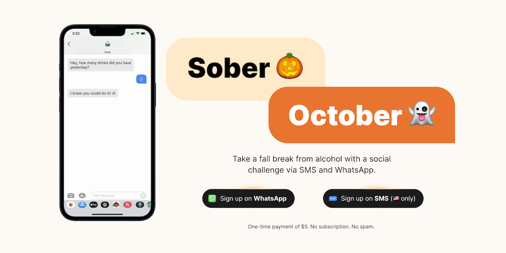Take a fall break from alcohol with this fun messaging based challenge. Get 1 text per day from the Arpy AI chatbot to log your progress and see how others in the challenge are doing as well. **Availa