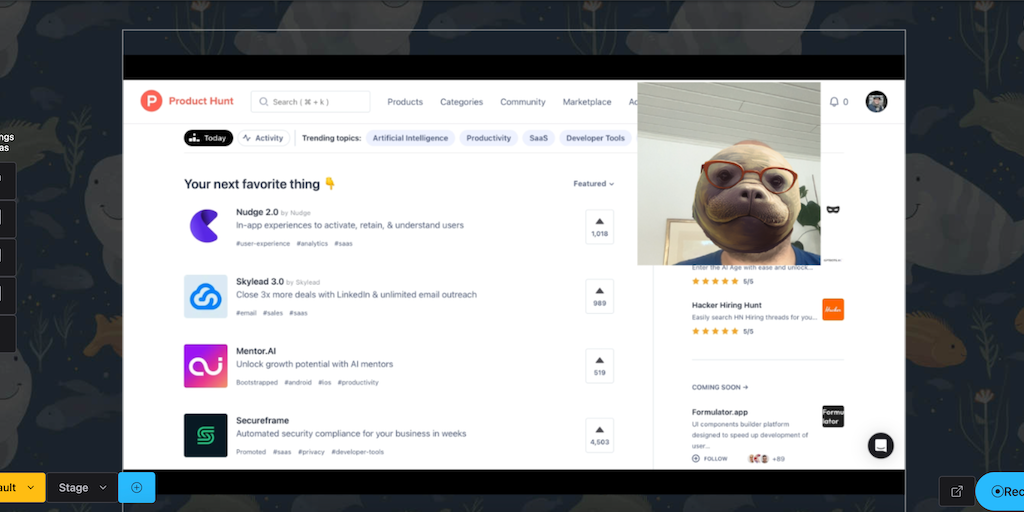 Camera and me, the Manatee - Browser only screencasting software, OBS alternative | Product Hunt