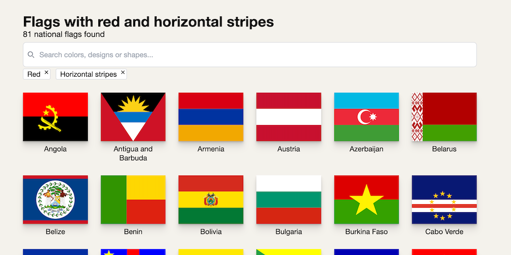 FlagLookup.com allows you to find national flags based on different attributes, like shapes, colors, or patterns. Wonder which color is the dominant in flag designs? Or which type of stripes is the mo