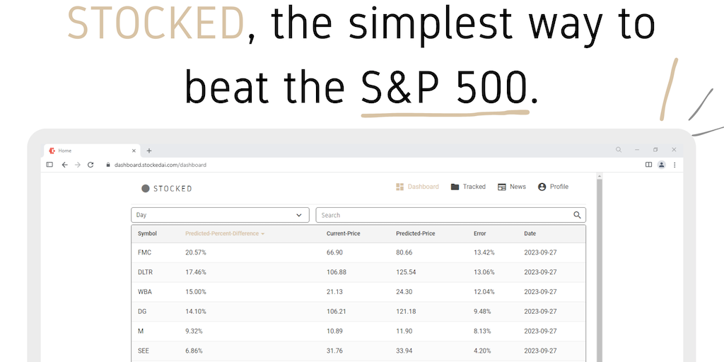 Research shows that 99% of active traders fail to outperform the S&P 500. Meet STOCKED - the platform that gives you access to high quality, effective, and unique machine learning generated stock pred