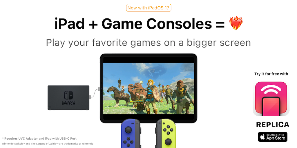 Replica, a screen mirroring app, now supports playing Nintendo Switch games on your iPad. Simply connect with a UVC adapter and HDMI to start playing on your iPad's display!