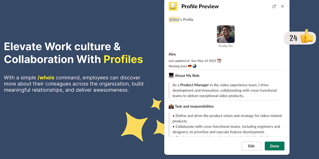 Elevate Work Culture and Collaboration with AI poweredProfile For Slack, an app that let colleagues connect over chats and build connections, Praise or Send Wishes. Build an inclusive culture where ev