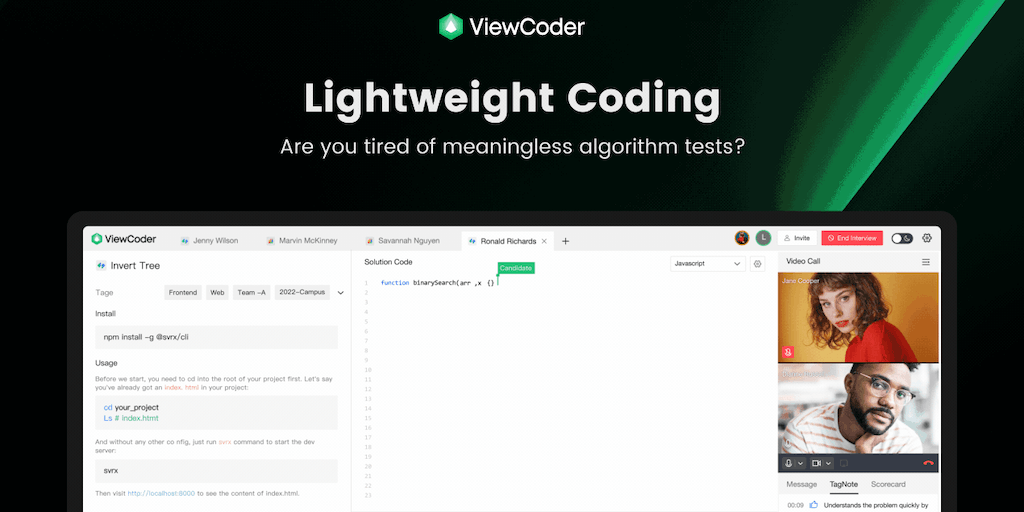 ViewCoder is a technical interview platform, It keeps the interviewer distraction-free by recording and transcription, coding beyond boring algorithms for a better candidate experience, make confident