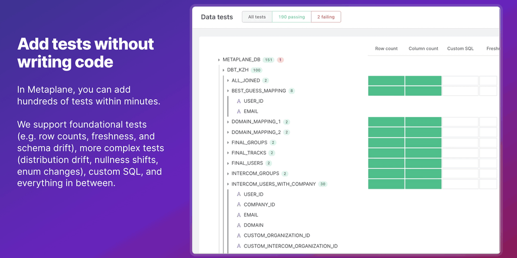 Metaplane is the Datadog for Data — a data observability tool that continuously monitors your data stack, alerts you when something goes wrong, and provides relevant metadata to help you debug.