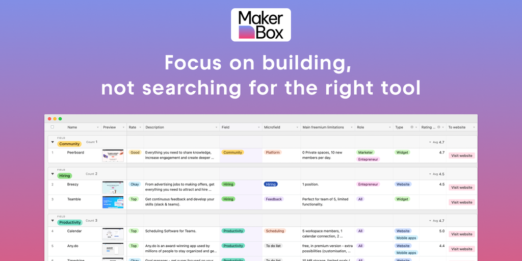 Save your time with MakerBox. Get the list of 600 products with generous Free plans 🔥 Pick the best development, marketing, design tools. Grow your product without breaking the bank. Hand-picked by In