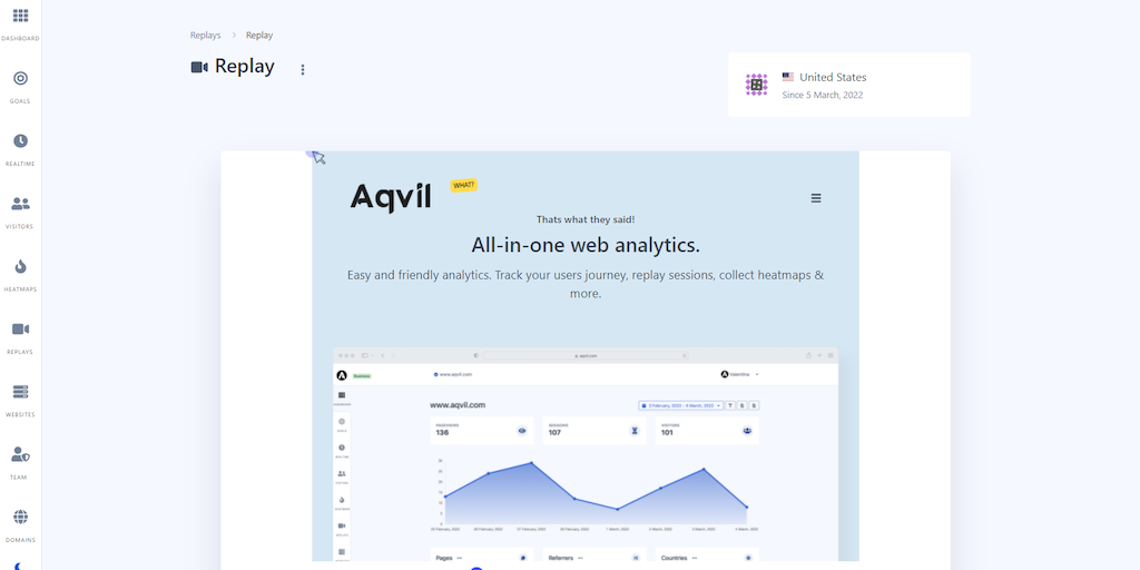Aqvil provides you all the valuable website traffic metrics in a simple web analytics dashboard. Check out heatmaps, replays, goals and real time visitors to better understand how to improve the exper