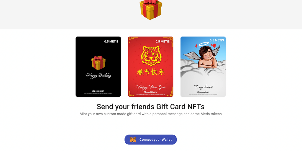 Gift Card NFT is like Amazon Gift Cards but built on top of Metis Ethereum Blockchain, a Layer 2 solution. These gift cards are custom-made minted as NFTs for you to collect and send.