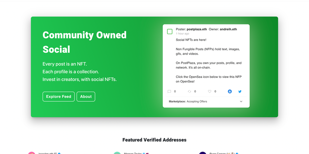 PostPlaza is a community owned web3 social network. Some quick info: • All posts are NFTs. • The social graph, posts, upvotes, etc are all on-chain. • Minting is free and 0 gas. • It has a built-in ma