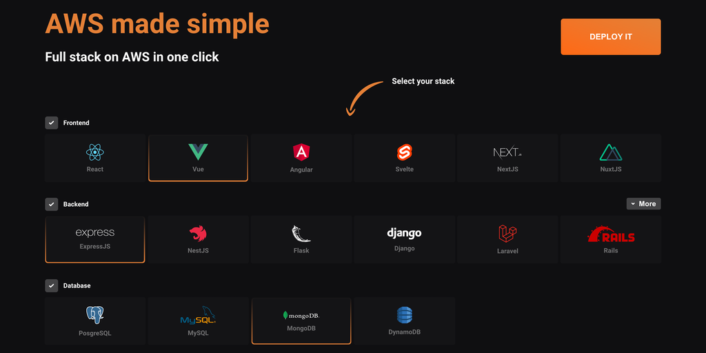 AWS is powerful, but hard to configure. With AWS Bootstrap you can set up a full-stack application on AWS in minutes. Just pick your favourite frameworks, connect your AWS account, and deploy!