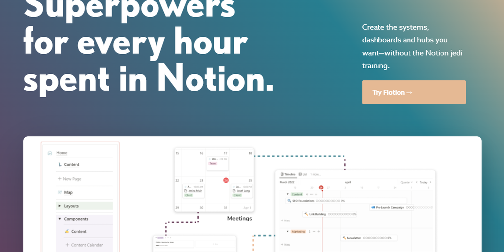 Flotion lets you drag and drop dynamically linked, pre-built business components from right inside your Notion pages. Client portals, marketing hubs, CRMs and more--helping you build custom business s