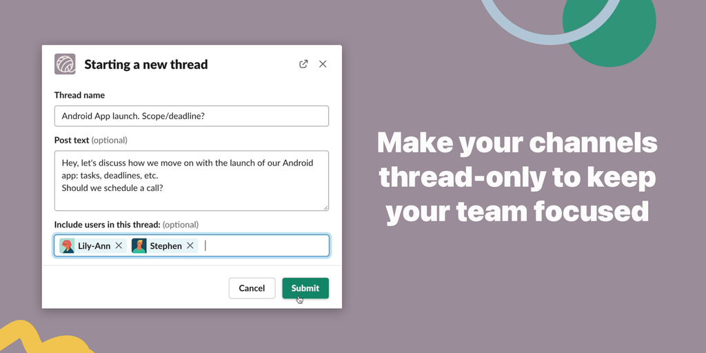 Make your Slack channels ‘thread-only’, meaning any messages sent to these channels will automatically become standalone threads. After your team has had their say, close threads with a resulting decision visible to everyone.