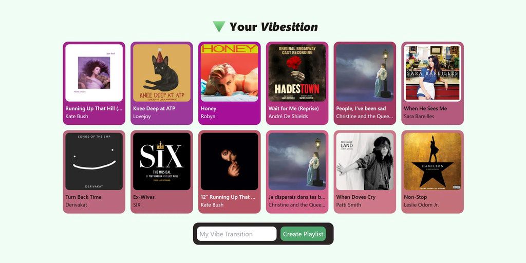 Vibesition allows you to create playlist that transitions from the vibe of one song to the vibe of another song using Spotify.