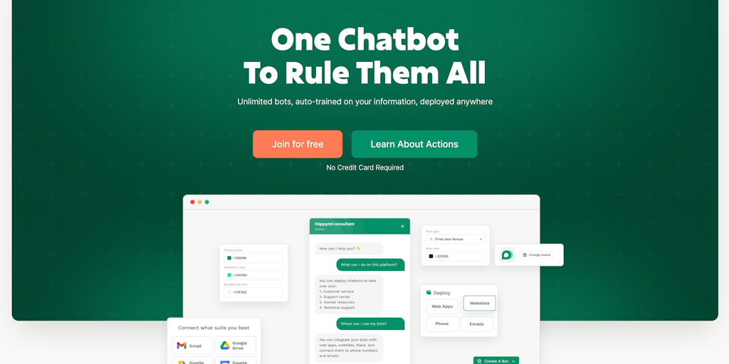Happyml allows users to deploy an unlimited number of fine-tuned chatbots that can be used for customer service, help desk, support center, guest services, HR, training, and consulting among other thi