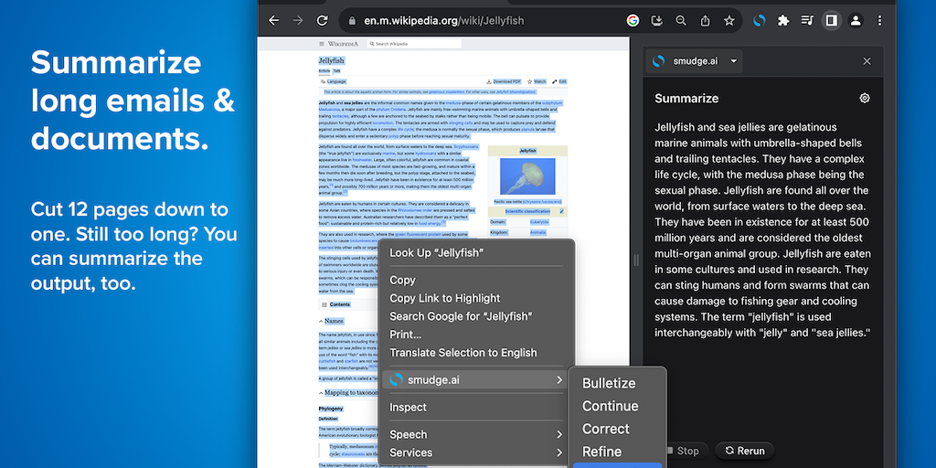 Smudge.ai is a Chrome Extension that puts AI tools into your right-click menu. Save your best ChatGPT prompts and reuse them wherever you go online. Or choose from over a dozen built-in commands that