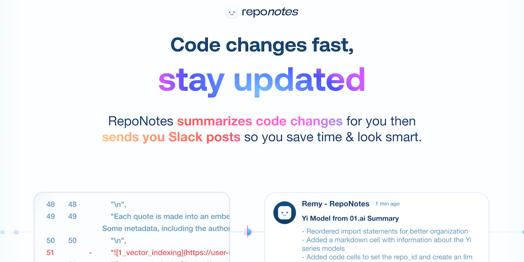 RepoNotes summarizes code changes then sends you Slack posts so you save time & look smart. It works by scanning Github repositories for code changes and transforming the code into well-written summar