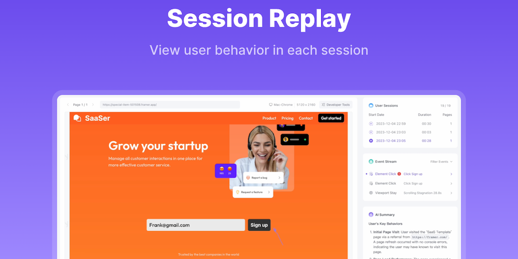 Stey uses AI to identify customer experience issues from replays of your user actions. Also you can easily query the actions you want to analyze using simple language, enhancing your efficiency in pro