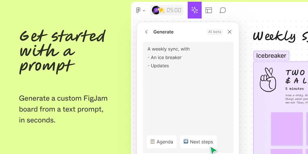Introducing AI features in FigJam to give your next team sync, retro, or planning session a much needed boost. Now, you can generate templates and visuals, sort stickies, and instantly summarize your
