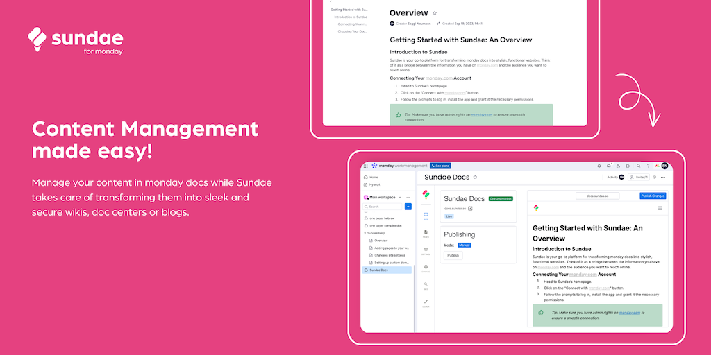 Sundae lets you easily transform your content in monday docs into beautiful websites: documentation, wikis, help centers, blogs, personal sites and more. Sundae takes care of the tech side, and automa