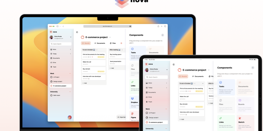 Nova is an all-in-one productivity tool where you can compose your own productivity model. Create a project and choose the services you need: you can write next-generation documents, add tasks, manage