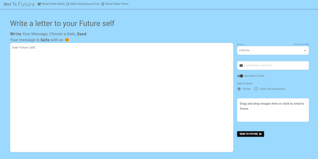 Your Time-Traveling Companion 🕰️ Send private, public, and image-rich anonymous messages to your future self or loved ones, all for free. Express dreams, and memories, and connect through anonymous po