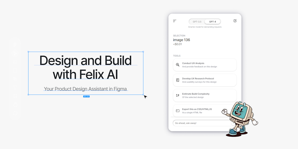 Felix is a context-aware, AI-powered Figma plugin that can understand designs and generate research protocols, give feedback, generate tailwind or react, and more, to help you develop software from 0