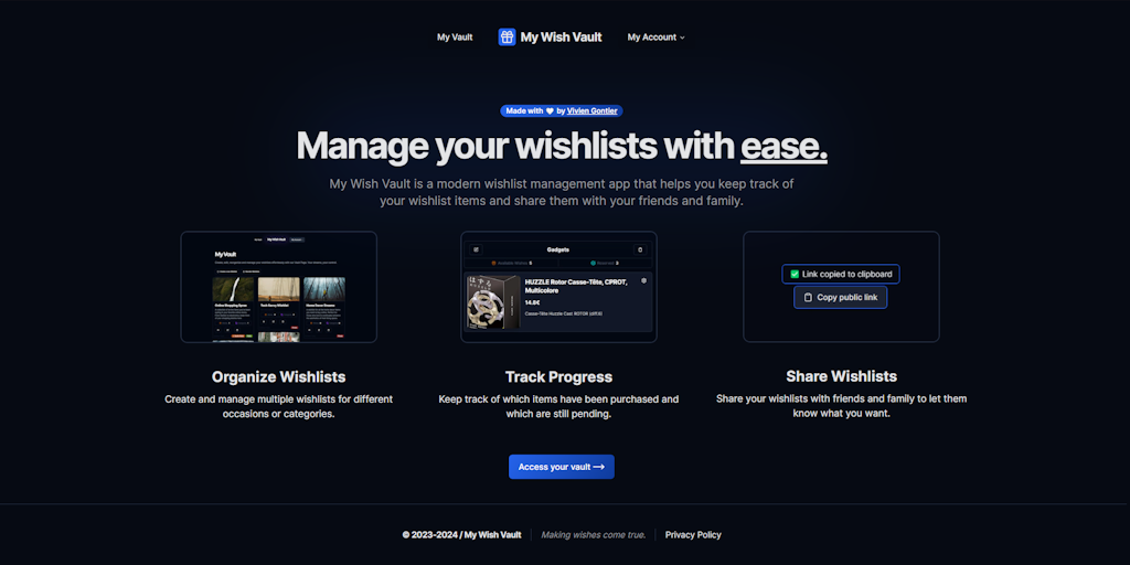 My Wish Vault is a modern wishlist management app that helps you keep track of your wishlist items and share them with your friends and family.
