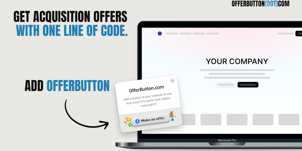 Never miss an acquisition offer again. One line of code lets buyers make offers while you build. 100% free to embed. Perfect for indiehackers and founders. Too many great products die because founders