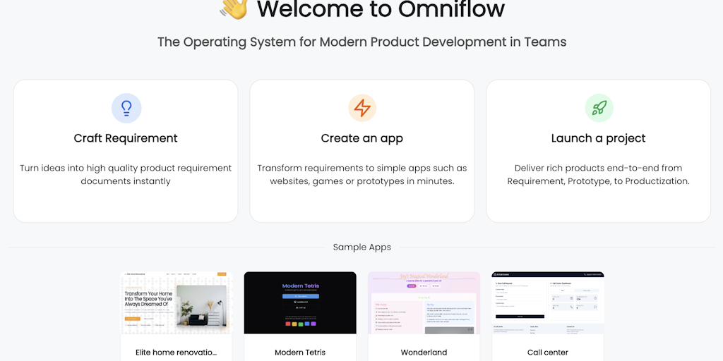Omniflow is an AI-powered platform that helps teams turn ideas into production-ready software fast. Generate clear requirements instantly, build apps/prototypes in minutes, and evolve them into high q