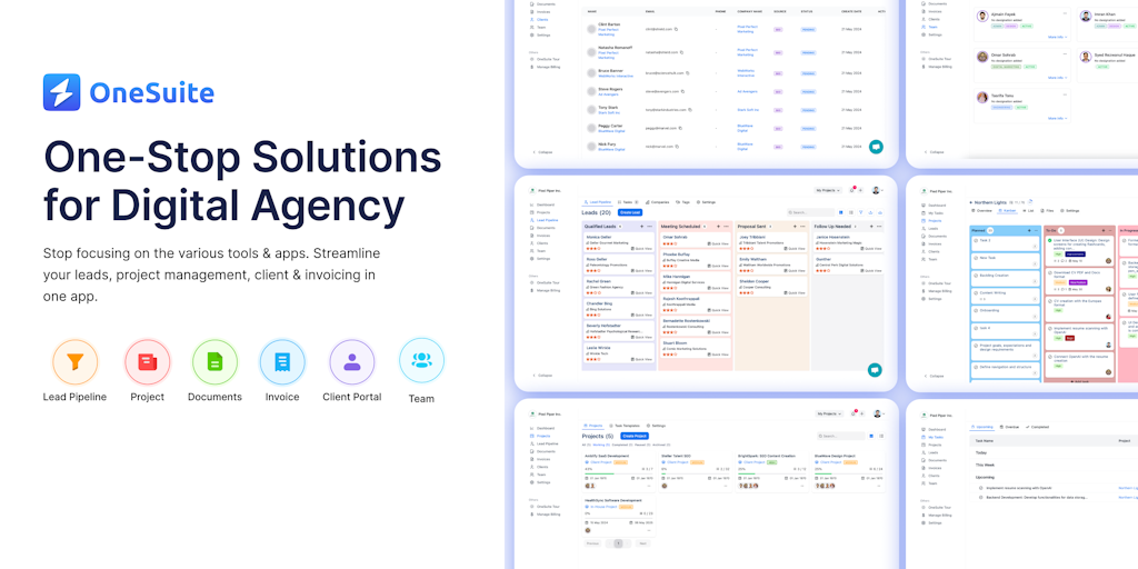 Struggling to manage your digital agency across multiple apps & tools? OneSuite is your all-in-one business hub! Manage projects, teams, leads, documents, clients, and invoices – all in one place. Fo