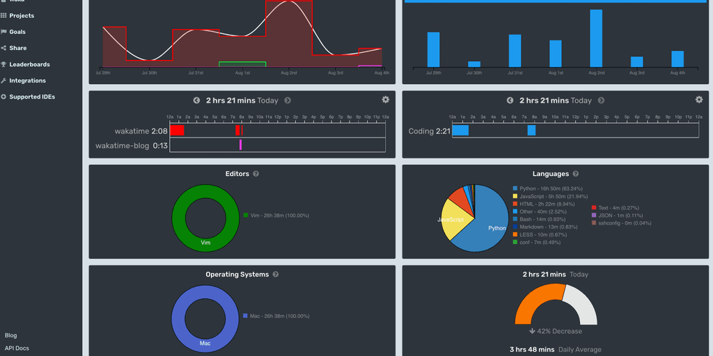 Answers to questions like: Which day do you code the most, and what's your daily average code time. Automatically compiled insights from your WakaTime programming activity.