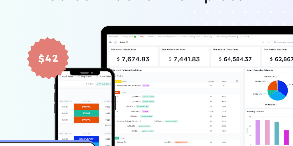 This ClickUp Sales Tracker template was made to easily integrate with your different payment processors and give you up-to-date sales breakdowns and reporting!